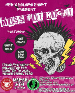 Miss Fit Night will be showcasing local bands like Cat Crash, Shirt Hole and King Like Mom. Items like sanitary products, clothing, towels and the like are being collected for donation to local women’s shelters.